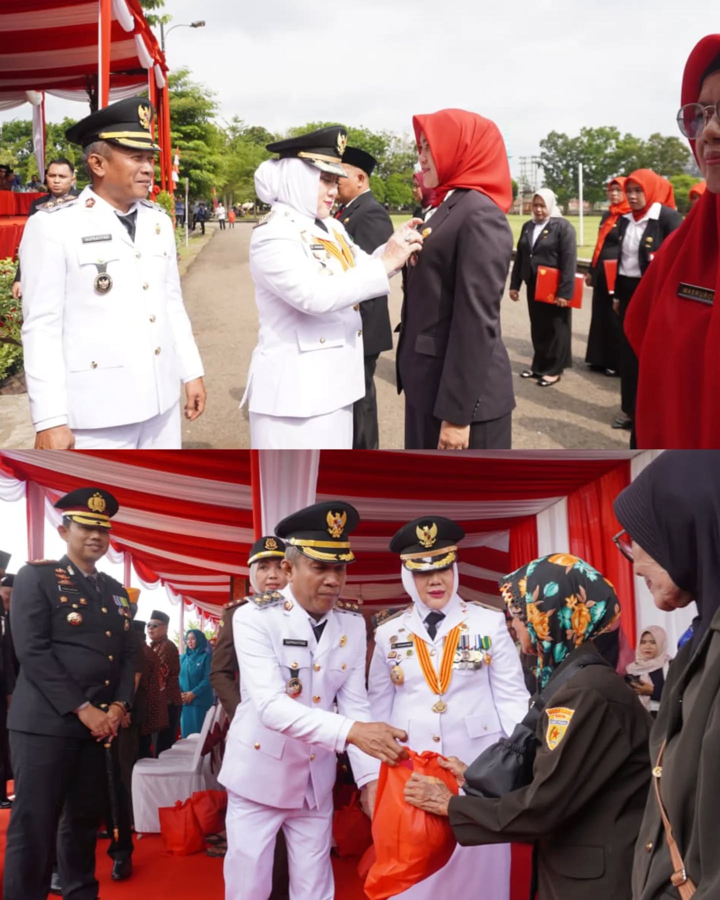 Diakhir Upacara, Bupati Musi Rawas Hj. Ratna Machmud menyematkan penganugrahan Satya Lencana Karya Satya (SLKS) kepada ASN yang telah mengabdi semala 30, 20, 10 tahun atas tanda kehormatan yang diberikan oleh Presiden Republik Indonesia kepada para PNS yang telah menunjukan kesetiaan, pengabdian, kecakapan, kejujuran, kedisiplinan serta prestasi kerja dalam melaksanakan tugas dan tanggung jawabnya sebagai abdi negara dan abdi masyarakat, serta memberikan cindera mata dan sembako kepada Veteran Republik Indonesia di Kabupaten Musi Rawas. (Rudi/Adv)