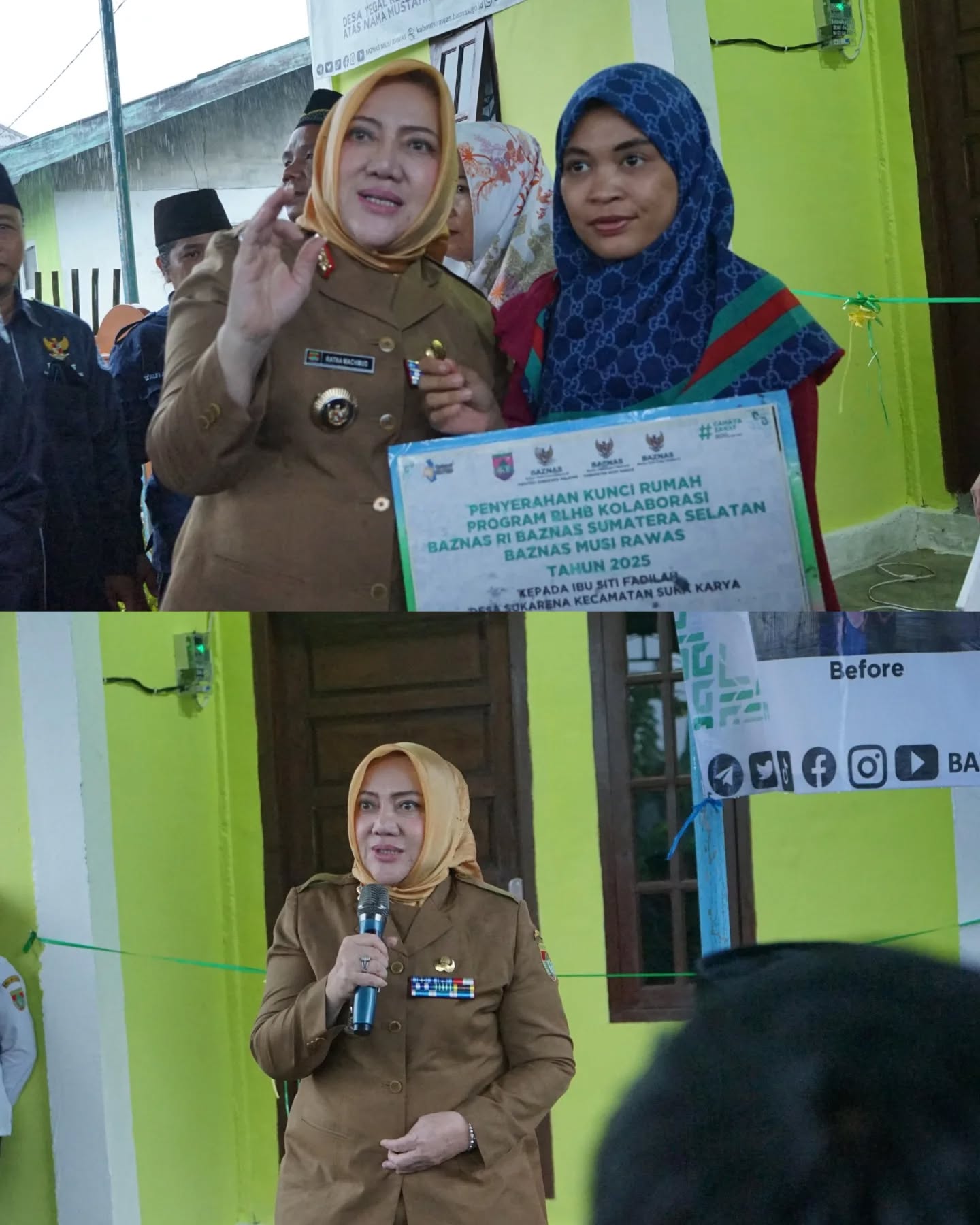 Musi Rawas, NS – Bupati Musi Rawas, Hj. Ratna Machmud, meresmikan sekaligus menyerahkan secara simbolis kunci Rumah Layak Huni Program Baznas Kolaborasi Tahun 2025 kepada para mustahik, bertempat di Desa D Tegal Rejo, Kecamatan Tugumulyo, Kabupaten Musi Rawas. Selasa (14/10/2025).