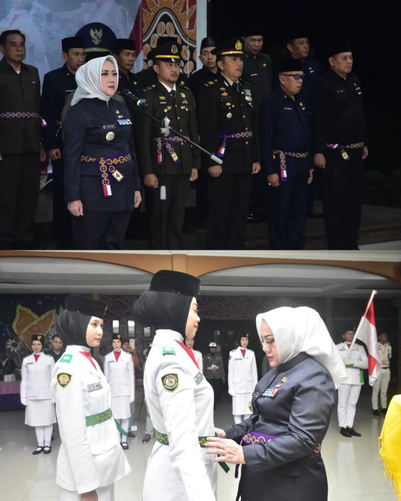 Musi Rawas, NS – Bupati Musi Rawas Hj Ratna Machmud Kukuhkan Pasukan Pengibar Bendera Pusaka (Paskibraka) merah putih Kabupaten Musi Rawas di Pendopoan Rumah Dinas Bupati Musi Rawas, Kamis (15/8/2025).
